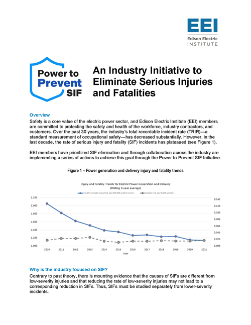 Safety is a core value of the electric power sector, and Edison Electric Institute (EEI) members are committed to protecting the safety and health of the workforce, industry contractors, and customers. Over the past 30 years, the industry’s total recordable incident rate (TRIR)—a standard measurement of occupational safety—has decreased substantially. However, in the last decade, the rate of serious injury and fatality (SIF) incidents has plateaued.