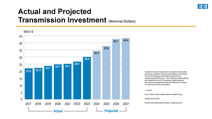 - Investor-owned electric companies are planning to invest approximately $158 billion on transmission construction between 2024 and 2027 (in nominal dollars).